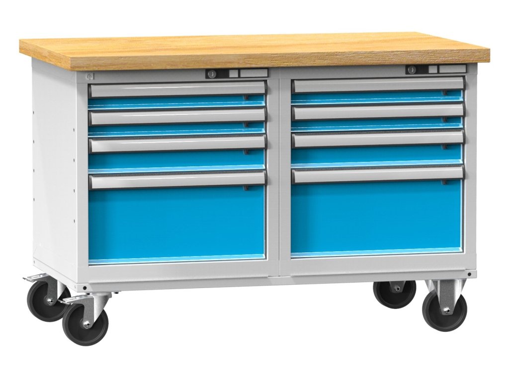 Mobile work table, worktop 1200 x 700 x 40 mm, table height 810 mm. Multiplex beech worktop (designation M - layered beech veneer) - 40 mm thick or 40 mm thick beech joint. Table load capacity 380 kg.