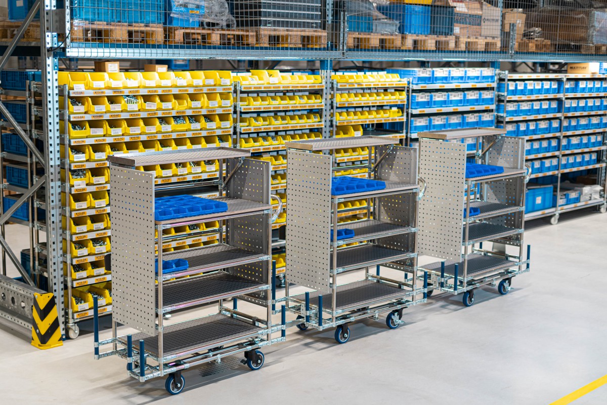 You don't have to worry about implementing Milk-run. You can start, for example, with a new handling cart equipped with an original mechanism, which is perfectly suited to logistics and production centers. Thanks to the small turning radius, the cart is able to turn even in a very small space. The handling cart provides the necessary mobility and efficiency that the Milk-run system requires. The trolley can be connected to a train of any length and thus ensure a sufficient supply of material in the production centers. The high-quality welded drawbar trolley can be customized to the customer's needs, be it color or dimensions.