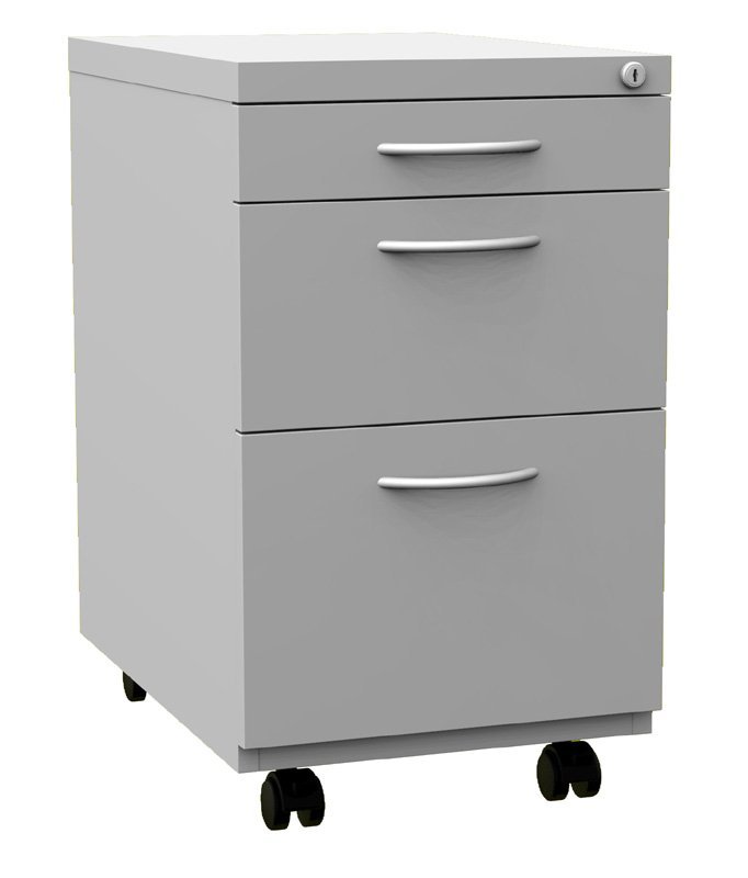 Mobile narrow office containers, central lock, 2 x standard drawers, one for hanging files. Height 645 or 651, width 300, depth 565 mm. The fifth wheel on the bottom edge of the deep drawer ensures stability even when it is fully opened. Variant without top plate or with top decorative plate 6 mm thick. Extension of standard drawers 80 or 100%, extension of high drawer 100%.