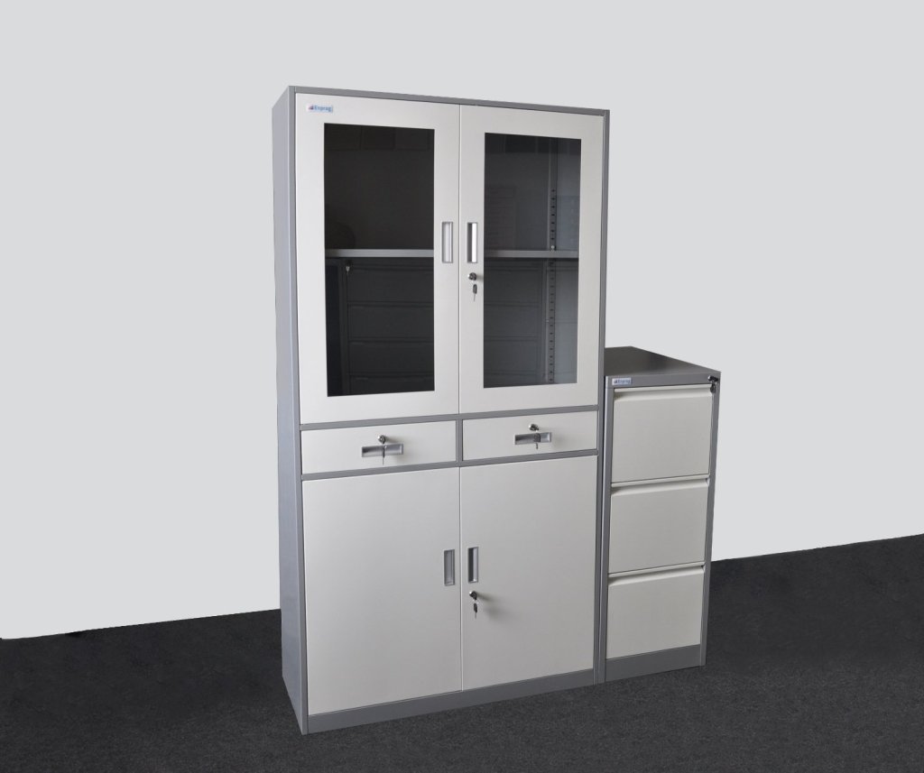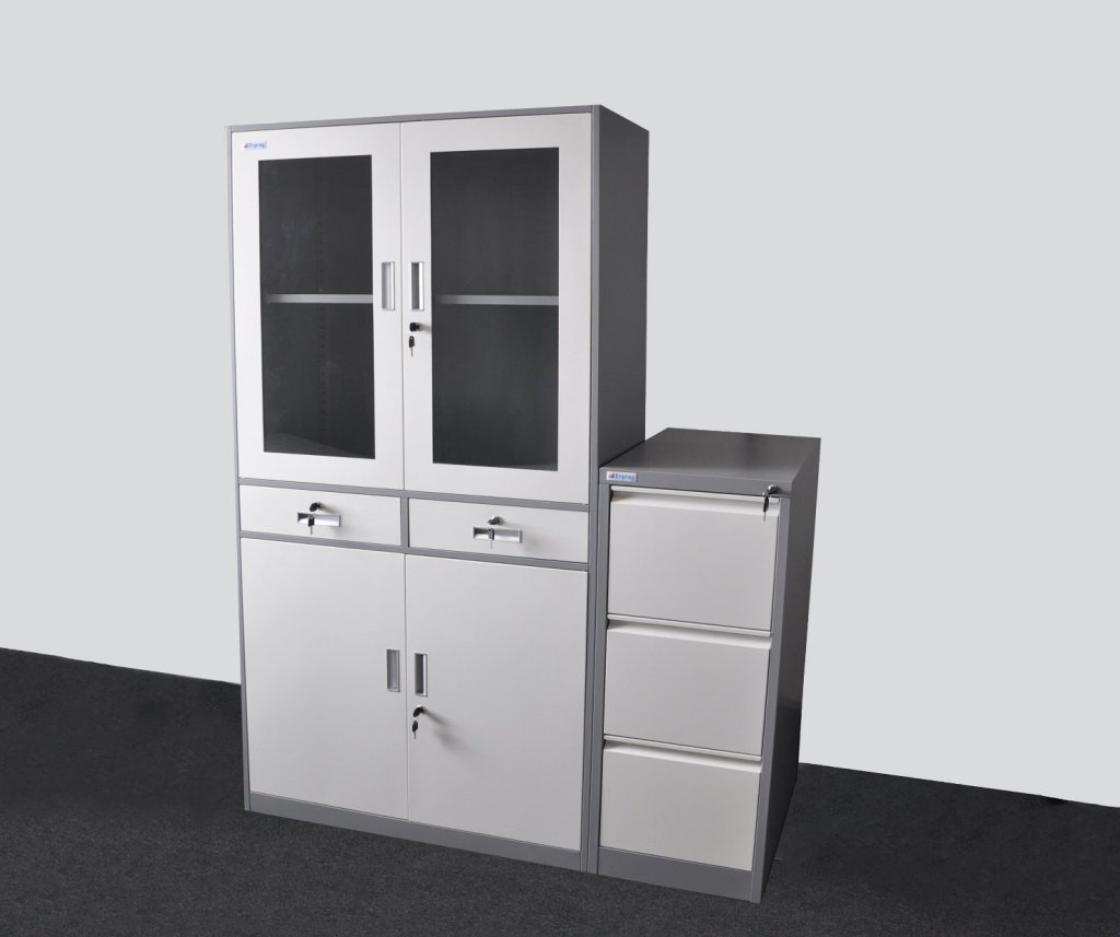 A set of office cabinets consisting of a file cabinet for A4 format and a filing cabinet. All made of high-quality and strong steel sheet with a thickness of 0.6 mm. Surface treatment with powder paint - body dark gray, doors and drawers white. Disassembly, easy and quick assembly according to the attached instructions.