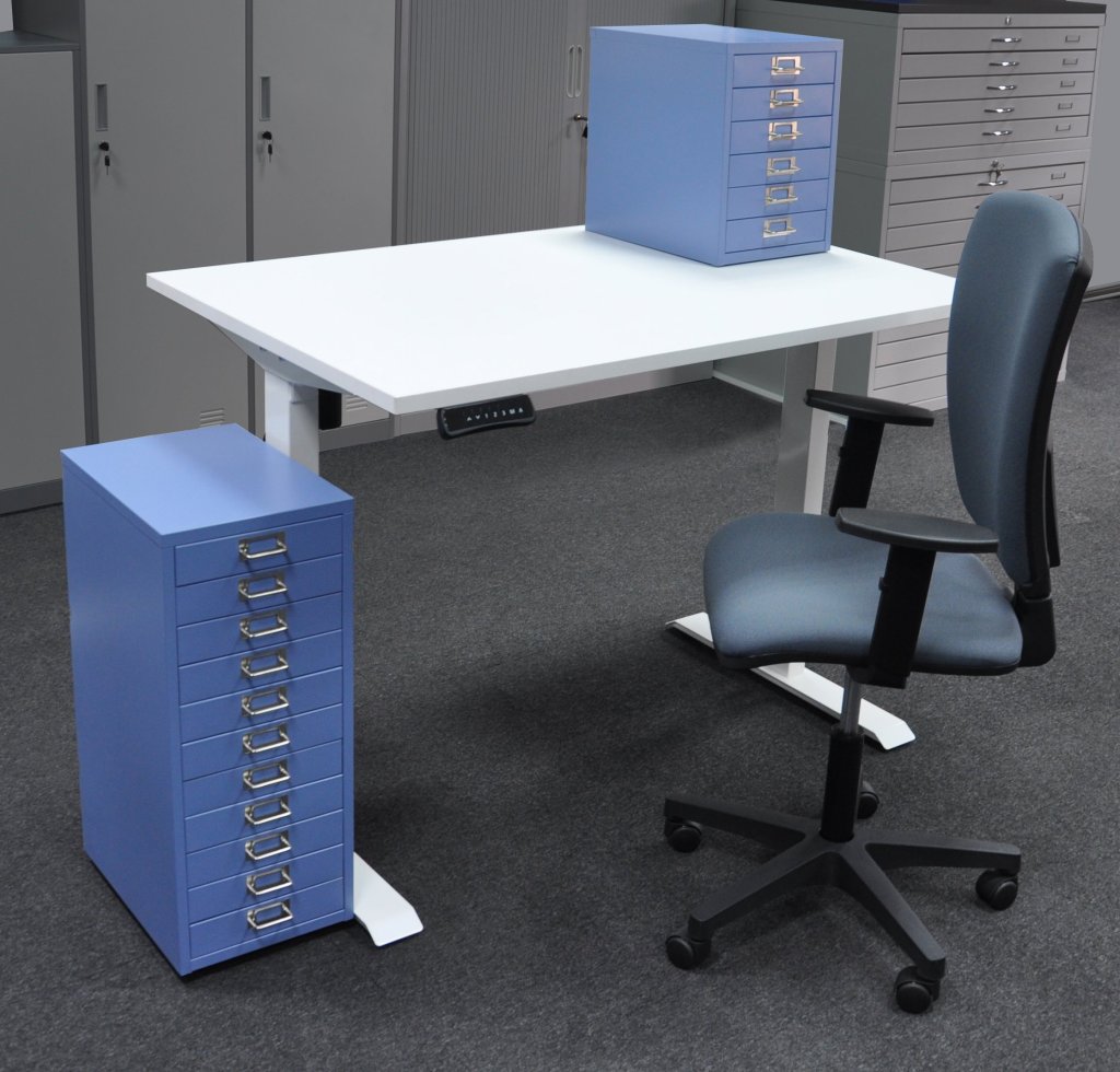 Electrically height-adjustable table with drawers. A total of 11 drawers ensure plenty of storage space. Tabletop height adjustment range 735-1235mm. Table top depth 800 mm. The table allows you to work both standing and sitting, thus preventing back pain when sitting for a long time. Several patterns of worktops to choose from, white base.