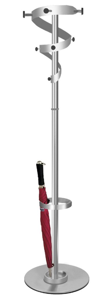 New Public metal hanger, in the lower part a gray plastic bowl + plastic cover of the "weight base", in the upper part plastic 4 pcs of coat hooks. The heavy base makes it very stable. Height 1770 mm, base diameter 400 mm. Surface treatment with gray matte powder coating, gray/black combination hooks.