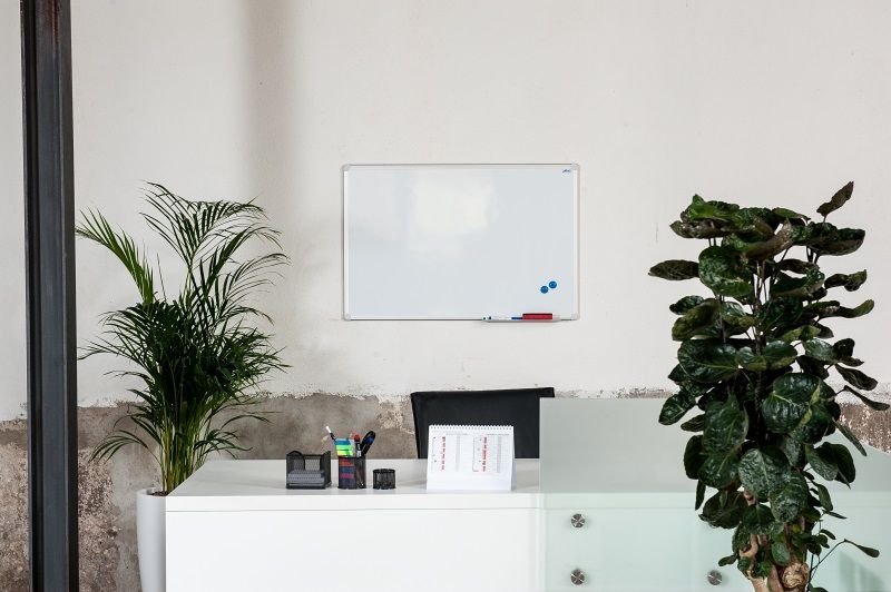 One-piece magnetic whiteboard with glossy ceramic surface and aluminum anodized frame (rounded edges). The surface of the board is fired at a high temperature of 900°C, suitable for the highest load with high scratch resistance. A storage shelf for markers is included. Supplied with wall mounting kit.