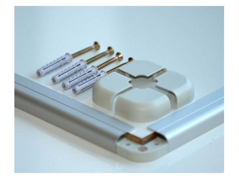 One-piece magnetic board with a white lacquered surface. Anodized aluminum frame in a natural shade, plastic corners. A storage shelf for markers is included. Supplied with wall mounting kit.