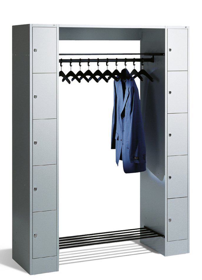 Metal cabinet with five lockable boxes, width 300, height 1850, depth 500 mm. The width of each compartment is 300 mm, the lock can be replaced with a padlock or coin lock. Body color RAL 7035 light gray.