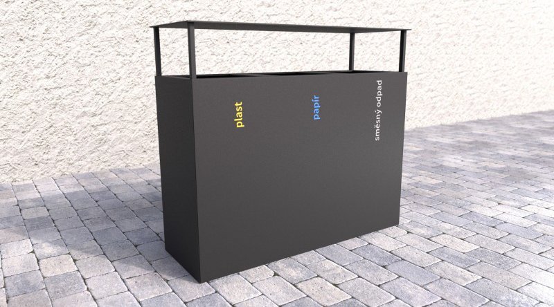 Outdoor trash can for sorted waste with a roof. Highly resistant to vandalism and weather. The wooden slats of the bin are treated 3 times with a glaze that protects the outdoor furniture from UV radiation and weather effects. Surface treatment with powder paint or hot-dip zinc. Volume 3x 65 l. Dimensions 970 x 970 x 400 mm.