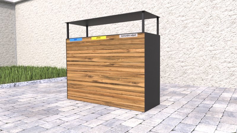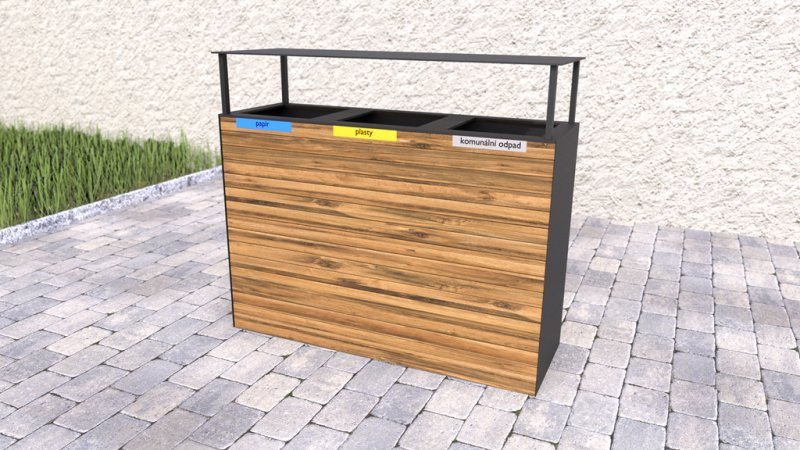 Outdoor trash can for sorted waste with a wooden shell and roof. The wooden slats are treated 3 times with a glaze that protects outdoor furniture from UV radiation and weather effects. The basket has removable galvanized inserts for waste with a volume of 65 l. Weight 80 kg.