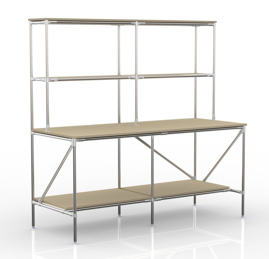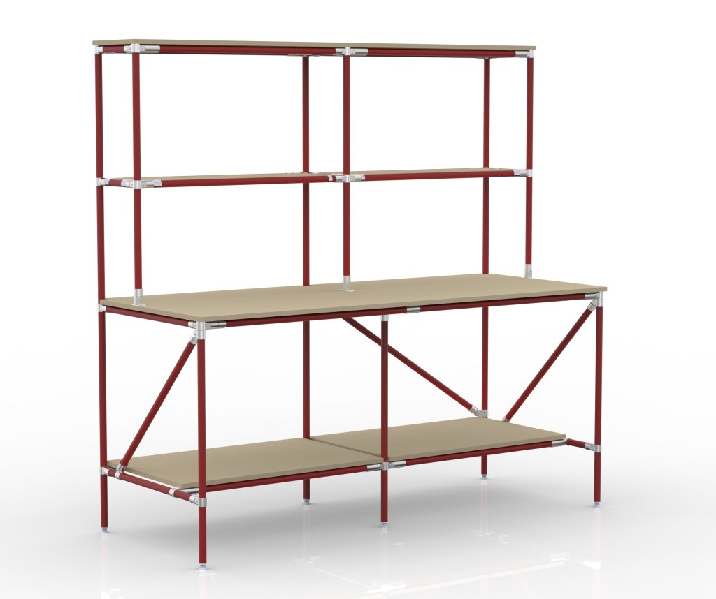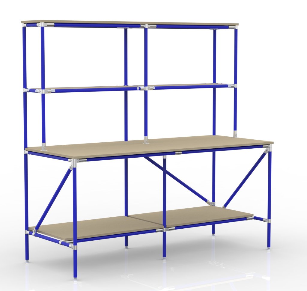 Economical and flexible packing table with storage space from the tubular modular system. The worktop and shelves are made of chipboard with a thickness of 18 mm. Construction dimensions 1970 x 2000 x 800 mm. The total load capacity reaches 350 kg, with the load capacity of an individual floor up to 100 kg.