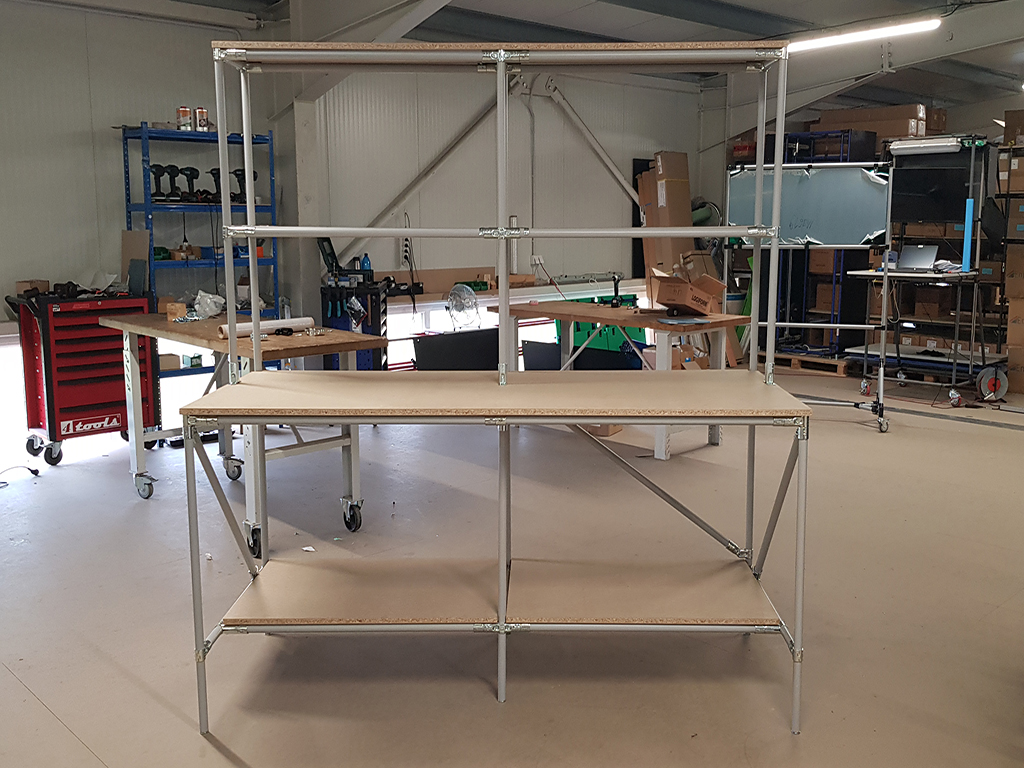 Packing table with storage space from pipe system 24020580