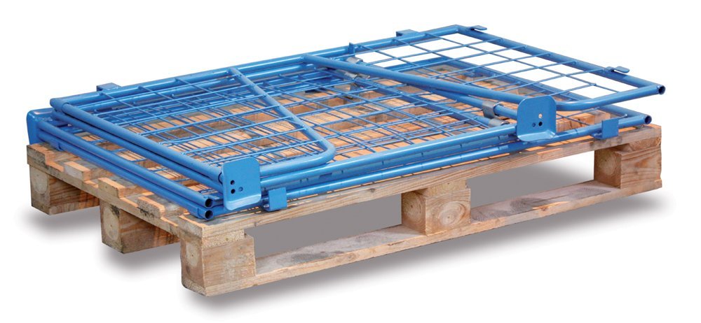 Construction from welded steel pipes. Surface treatment painted powder color RAL 5010 blue. Wall panels made of wire mesh 100 × 100 mm. One longer side with cutout. When fixed to the EUR-pallet, a storage space is created for storage. Barrier height 1000 mm, for pallets of size 1200 x 1000 mm. Stackability - 3 pieces, load capacity 1000 kg. The palette is not included in the delivery.