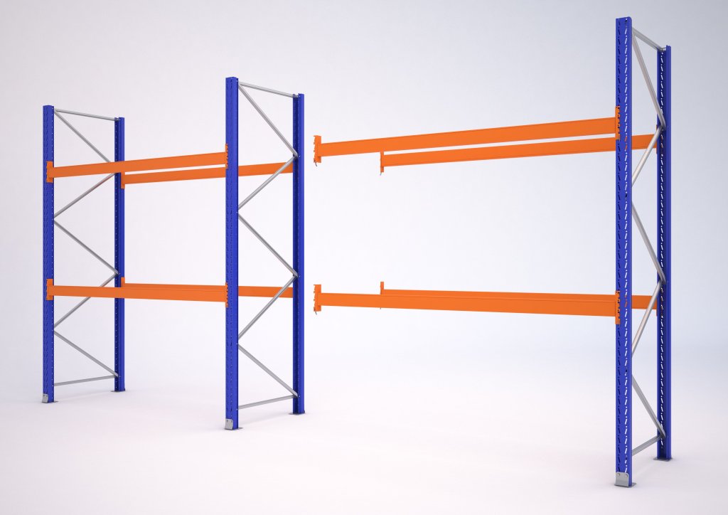 Port pallet rack. Load capacity 900 kg for 1 pallet, height 3366 mm, width 2700, depth 1100 mm, number of beam levels 2. Lacquered racks in blue RAL 5010, beams orange RAL 2004. Only one rack - used for setting basic shelves. For these products, even with a purchase value over CZK 3,000 excluding VAT, shipping is paid according to the place of delivery. Personal collection in Chrudim.