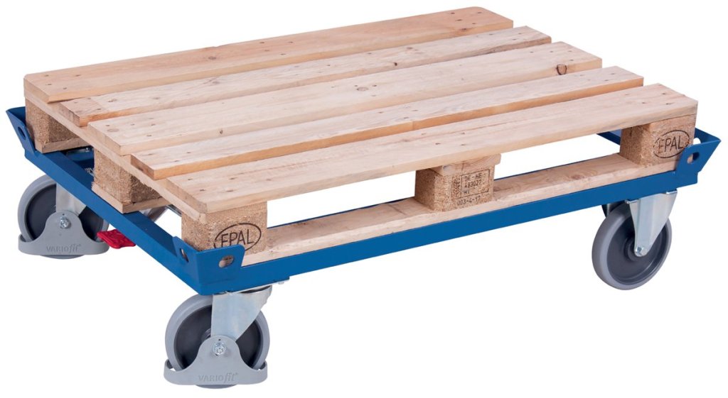 Trolley for Euro pallets or cage pallets. Steel construction. A stop in each corner to capture the pallet. Powder color RAL 5010 gentian blue. Quality rubber wheels with ball bearing. Vehicle load capacityto 500 kg.
