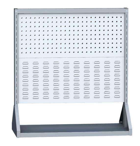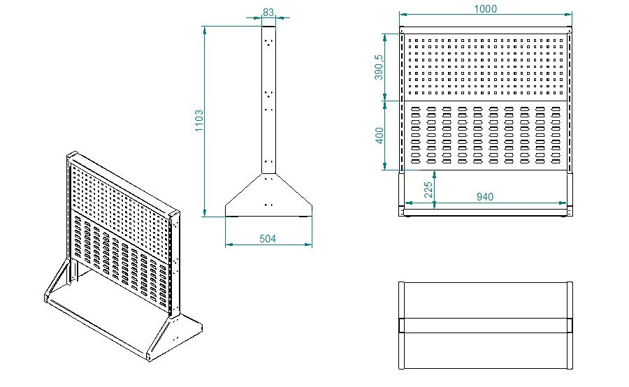 Fixed double-sided perforated stand for 4 panels. Used for hanging tools and plastic boxes. Overall dimensions of the stand in mm (H x W x D) 1103 x 1000 x 504.