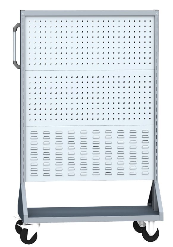 Movable double-sided perforated stand for 6 panels. Used for hanging tools and plastic boxes. Overall dimensions of the stand in mm (H x W x D) 1657 x 1055 x 504.