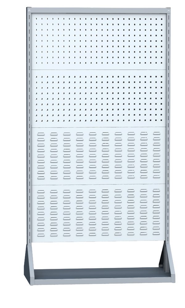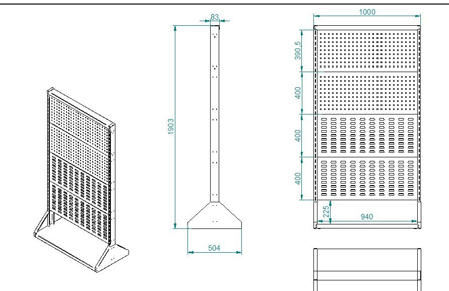 Fixed double-sided perforated stand for 8 panels. Used for hanging tools and plastic boxes. Overall dimensions of the stand in mm (H x W x D) 1903 x 1000 x 504.
