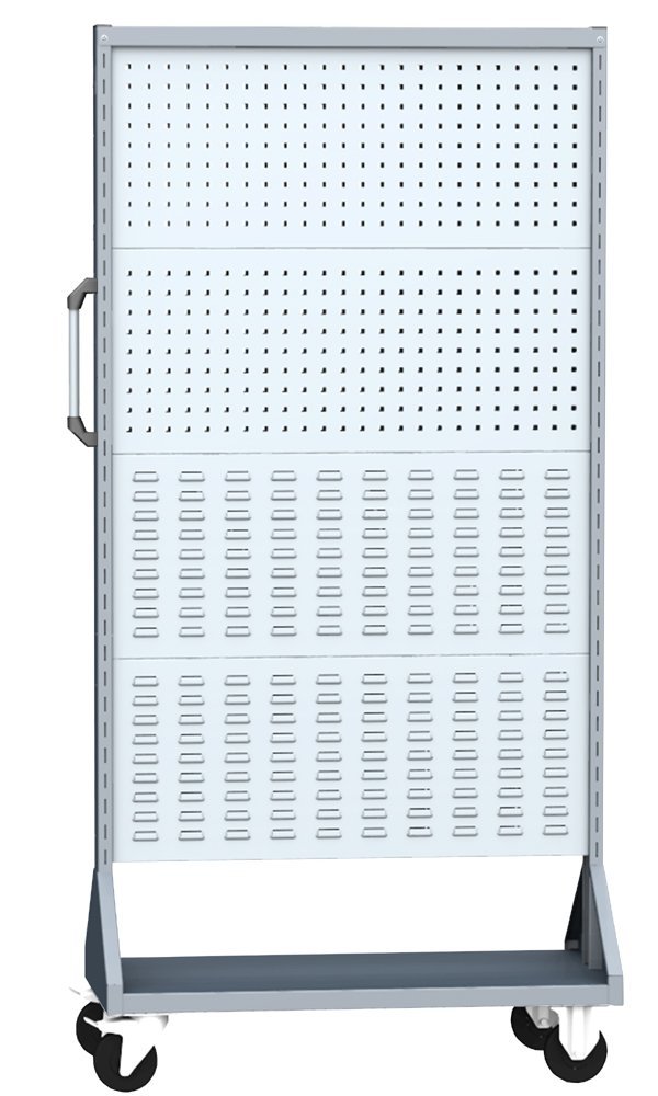 Mobile double-sided perforated stand for 8 panels. Used for hanging tools and plastic boxes. Overall dimensions of the stand in mm (H x W x D) 2057 x 1055 x 504.