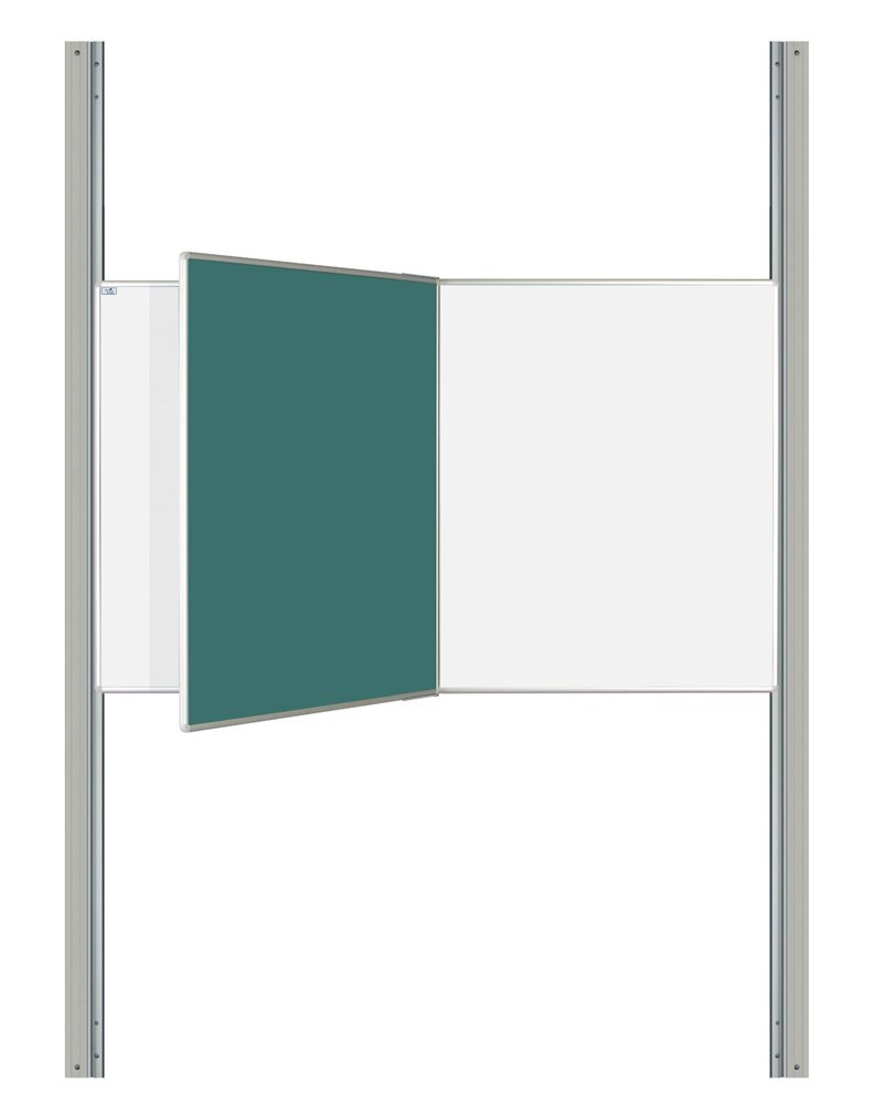 Magnetic ceramic whiteboard with a central rotating wing. Anodized aluminum frame in a natural shade, plastic corners. Combined surface for writing with chalk, green color, for writing with a marker, white color. Supplied with wall mounting kit. Dimensions height 120 x width 240 cm. Can be fixed to the wall, Lifting stand AL or PYLON AL.