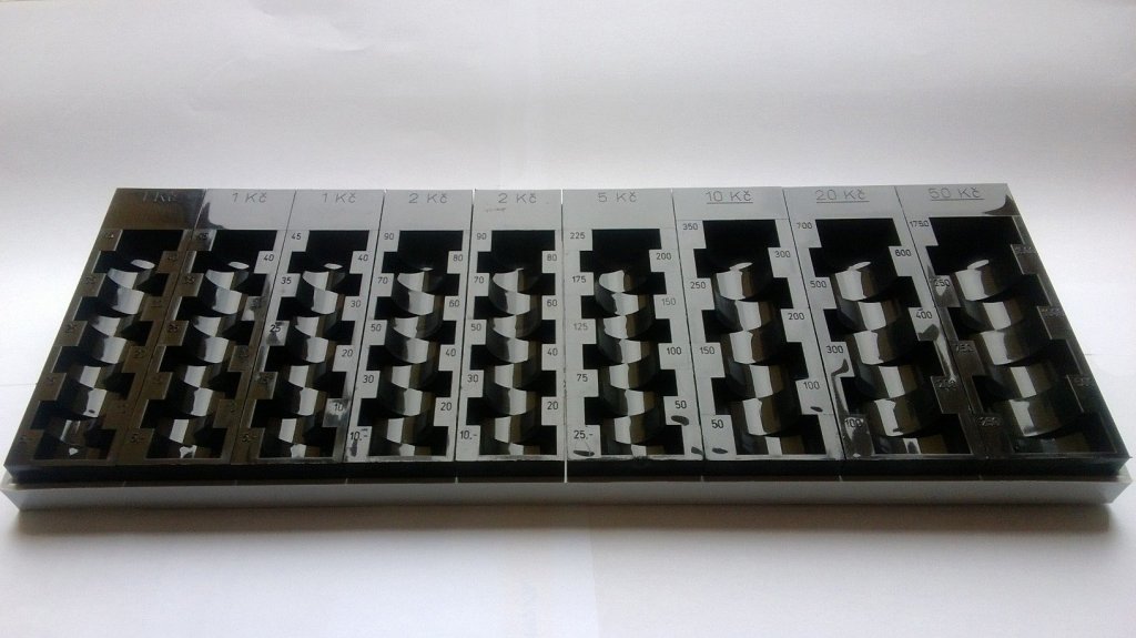 Plastic file for coins CZK, width 325, height 45, depth 120 mm. A practical aid for all traders, exchange offices and authorities full description and parameters