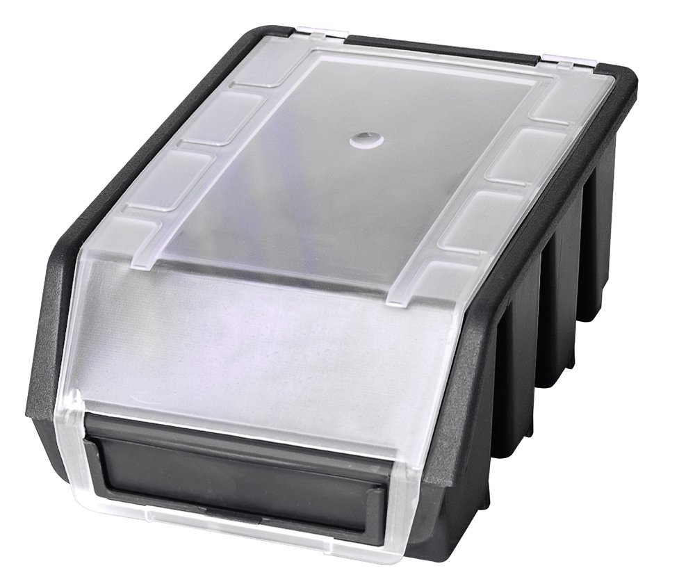 Ergobox 2 Plus plastic containers in black. Transparent lid, space for a label. Suitable for hanging on plastic or metal rails. Stackable. Height 75, width 116, depth 161 mm.