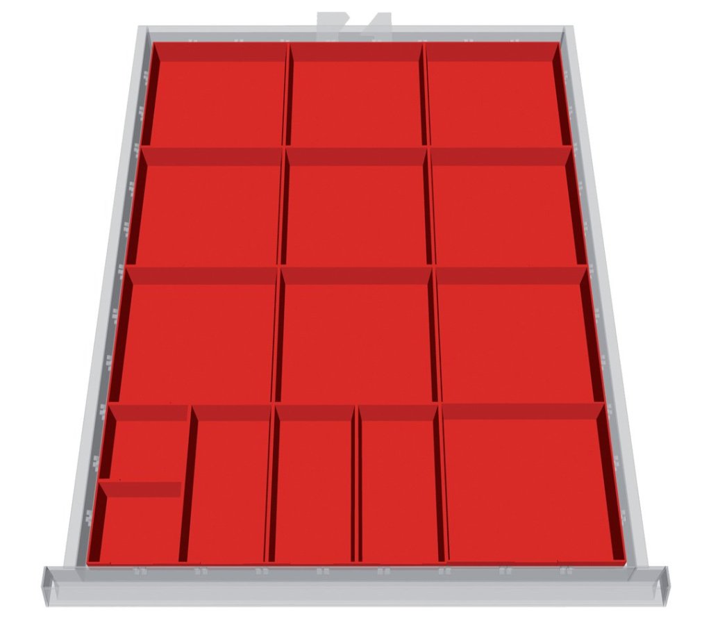 Division into drawers - set for 3 drawers. Contains 1x rubber insert for drawers 50 - 200 mm high, 1x plastic divider for drawers 100 - 150 mm high and 1x metal divider for drawers 150 mm high. Only suitable for Bedrunka+Hirth drawer cabinets with a width of 555 and a depth of 736 mm.