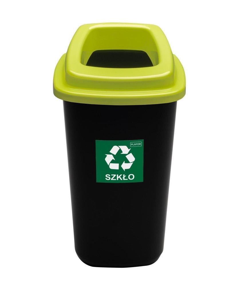 Plastic trasch can with a volume of 45 l made of black plastic for sorted waste with a green lid. The lid with the waste disposal hole is removable. The trasch can is marked with a sticker (can be peeled off). Resale of stock.
