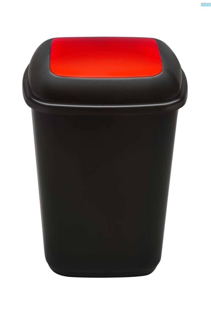 Modern plastic trash can with a volume of 45 l made of black plastic for sorted waste with a red flap in the lid. The lid with spring is removable. The trash can is marked with a sticker (can be peeled off). Resale of stock.