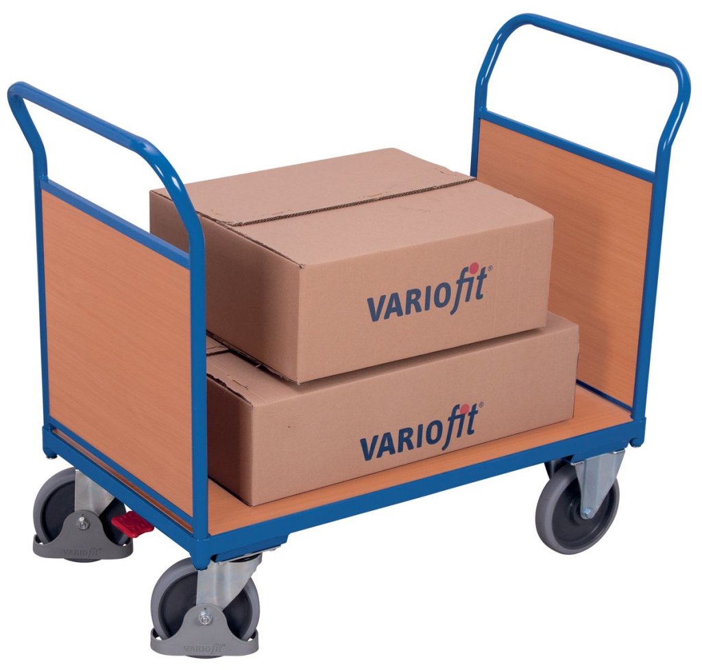 Steel construction, wooden loading surface - beech. Surface treatment with RAL 5010 blue powder coating, resistant to impacts and scratches. Highly durable thermoplastic castors with ball bearings, 2 swivel with central Easy Stop brake, 2 fixed. Dimensions height 1015 x width 1190 x depth 600 mm.