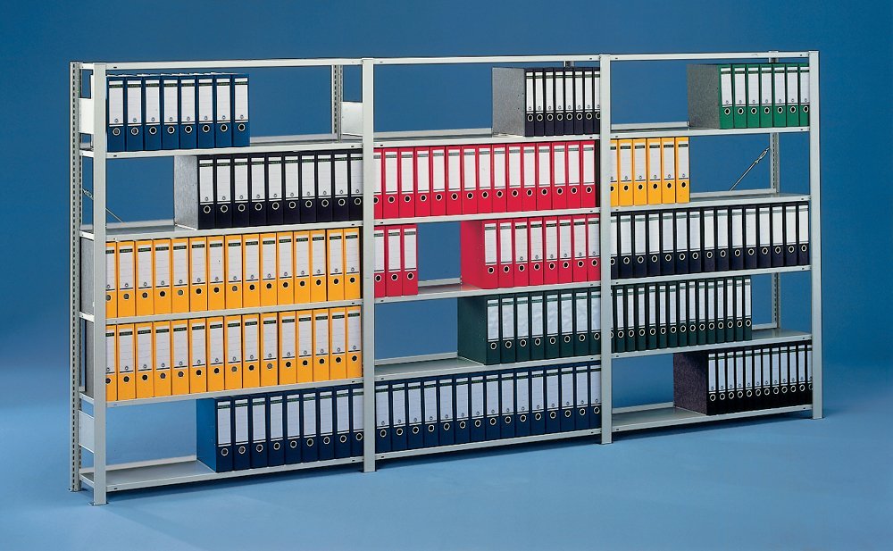 Shelving with pre-assembled frames, height 1850, 2200 or 2550 mm, width 1000 mm, depth 300 (one-sided) or 600 mm (double-sided shelving), 6, 7 or 8 shelves. Galvanized finish or light gray RAL 7035. Quick assembly without tools. Shelf capacity 80 kg, 5-year warranty. Only one web - used for setting the basic shelves.