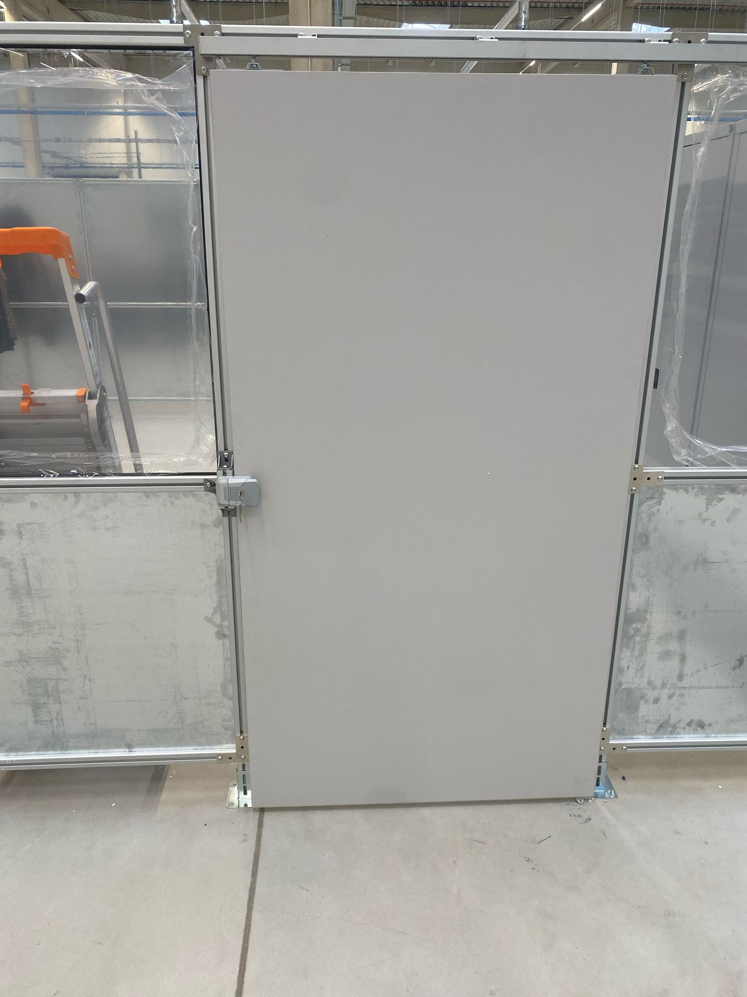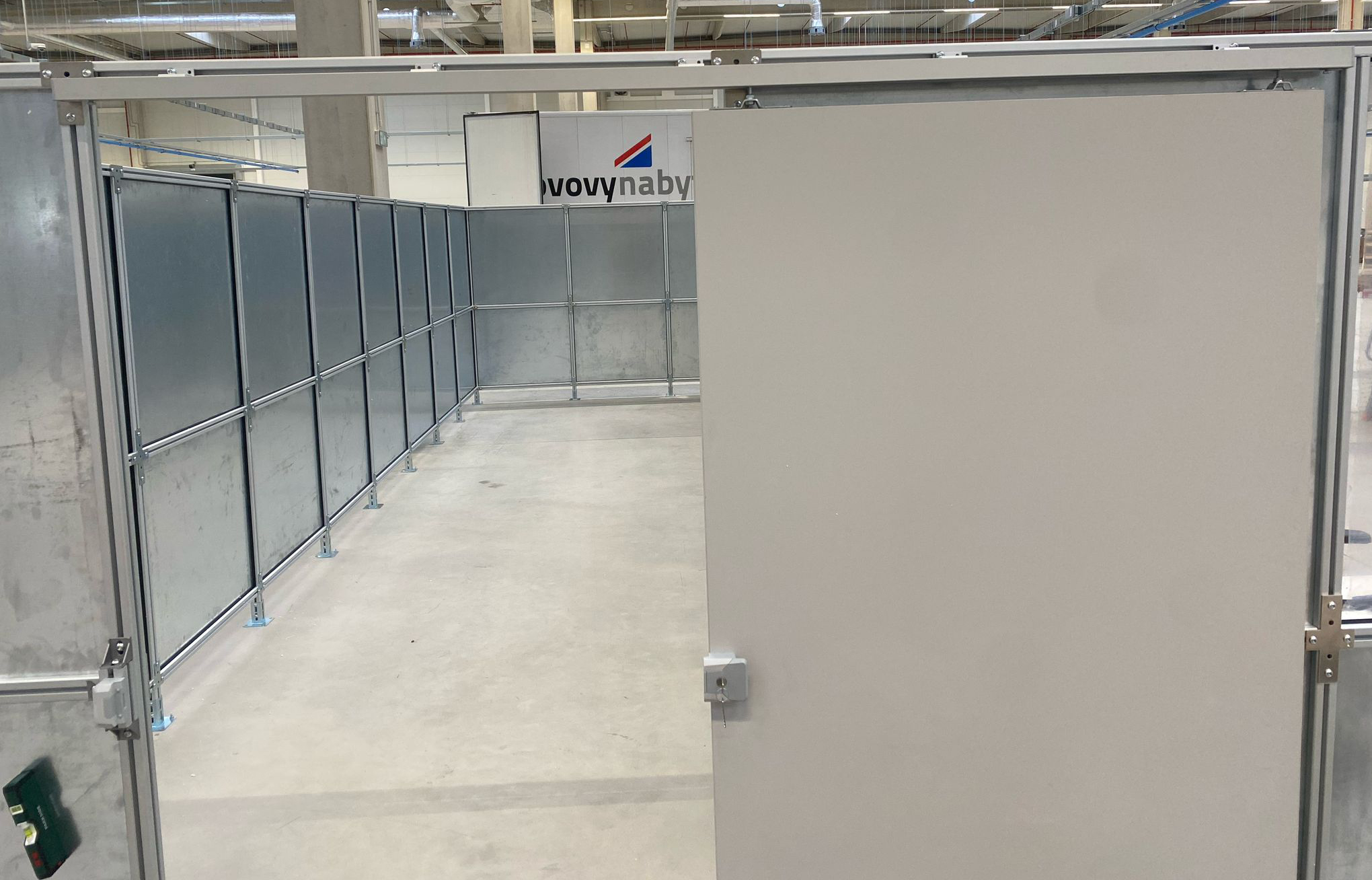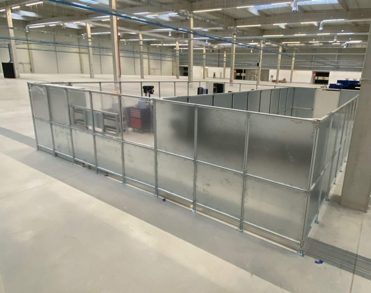 Protective security fencing, also known as safety fencing, is a key element in ensuring workplace safety. It is designed to restrict access to dangerous machinery and equipment, thereby protecting employees from injuries and accidents. This type of fencing is commonly used in industrial operations, warehouses, and manufacturing halls. The fencing is made from an aluminum frame with grounding via base plates. The infill can be made of KASI GLASS with a thickness of 3 mm or galvanized sheet metal with a thickness of 0.8 mm. The doors are made from 18 mm thick laminate board with a lock and can be either sliding or hinged. The fence can be custom-made in various designs. Dimensions: 2000 x 9040 x 8040 mm.
