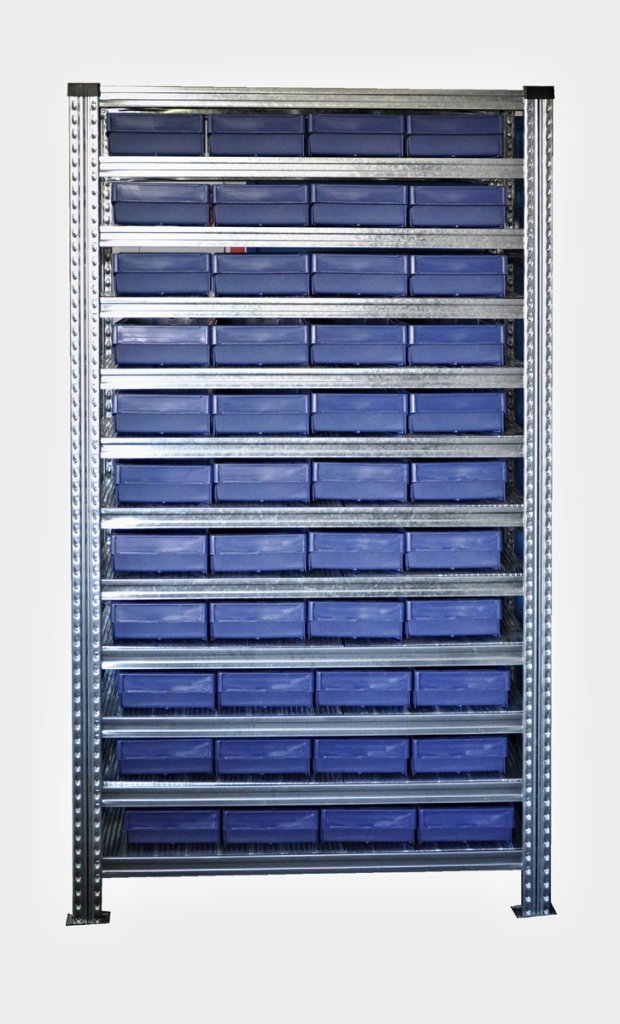 Screwless metal rack with rack crates. 12 shelves, load capacity 125 kg, column load capacity 1100 kg. Shelf dimensions h. 1972 x w. 1124 x d. 410 mm. Contains 88 shelf crates H. 100 x W. 115 x D. 400 mm. Warranty 2 years.