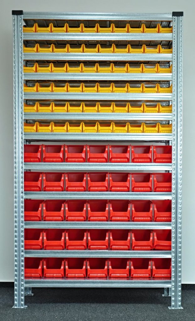 Screwless metal rack with plastic boxes. 12 shelves, load capacity 125 kg, column load capacity 1100 kg. Rack dimensions h. 1972 x w. 1124 x d. 330 mm. Contains 60x plastic box 456232 and 35x plastic box 456209. Warranty 2 years.