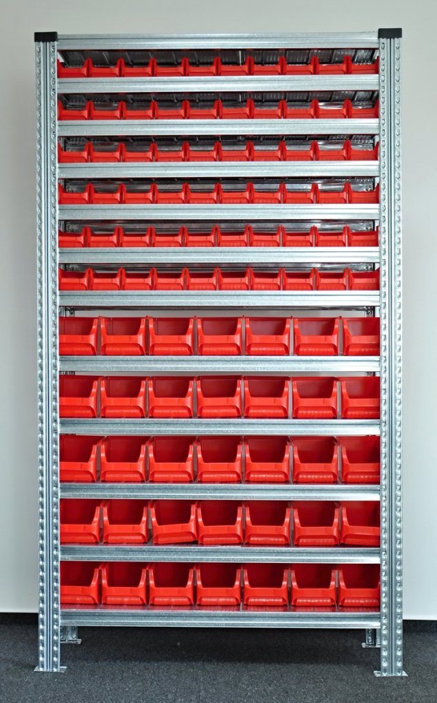Screwless metal rack with plastic boxes. 12 shelves, load capacity 125 kg, column load capacity 1100 kg. Rack dimensions h. 1972 x w. 1124 x d. 330 mm. Contains 60x plastic box 456231 and 35x plastic box 456209. Warranty 2 years.