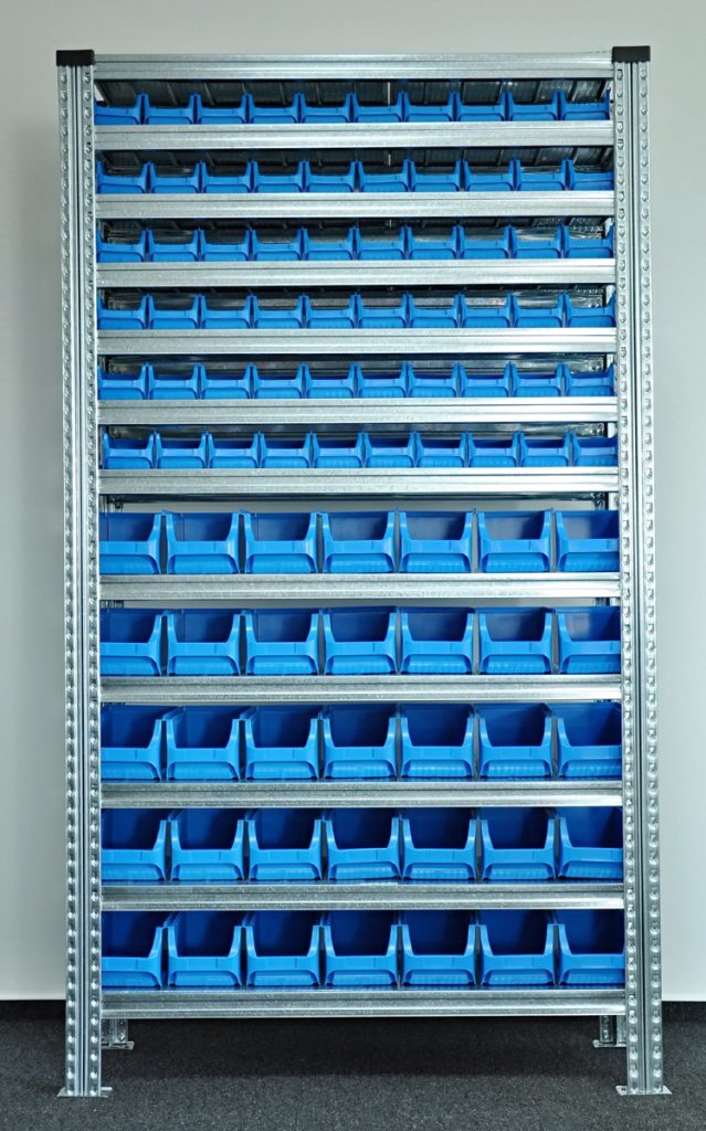 Screwless metal rack with plastic boxes. 12 shelves, load capacity 125 kg, column load capacity 1100 kg. Rack dimensions h. 1972 x w. 1124 x d. 330 mm. Contains 60x plastic box 456230 and 35x plastic box 456208. Warranty 2 years.
