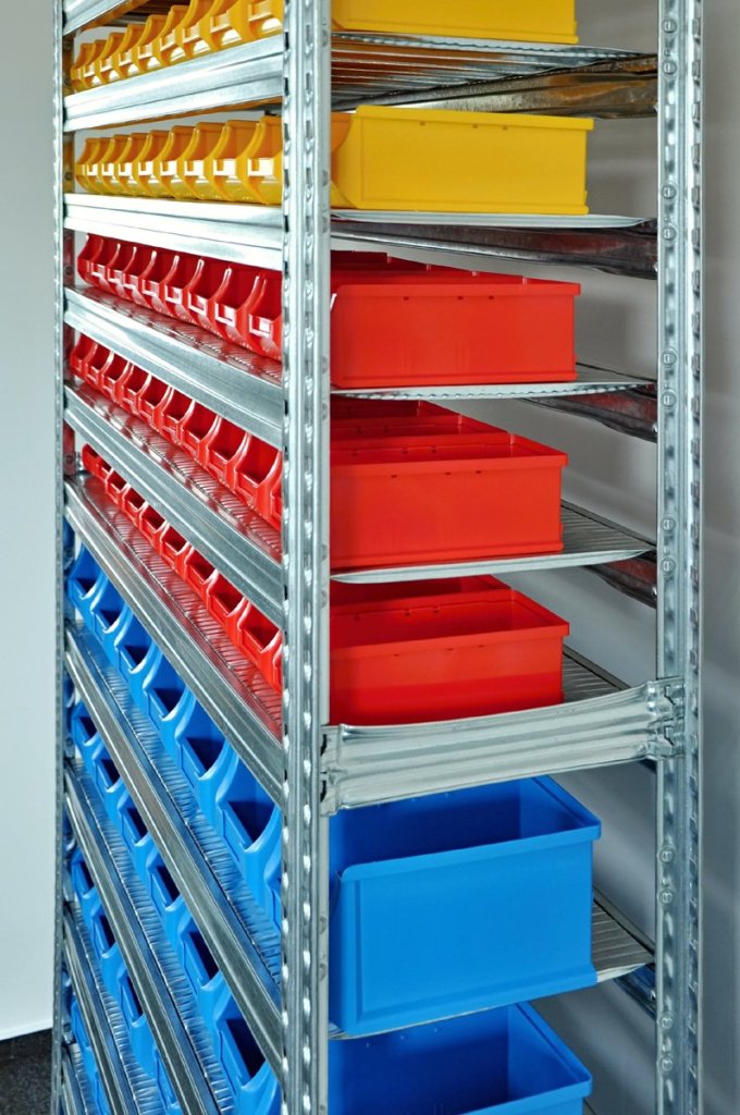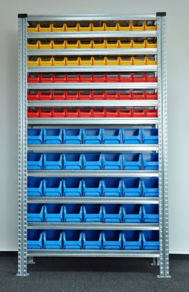 Screwless metal rack with plastic boxes. 12 shelves, load capacity 125 kg, column load capacity 1100 kg. Rack dimensions h. 1972 x w. 1124 x d. 330 mm. Contains 30x plastic box 456232, 30x plastic box 456231 and 35x plastic box 456208. Warranty 2 years.