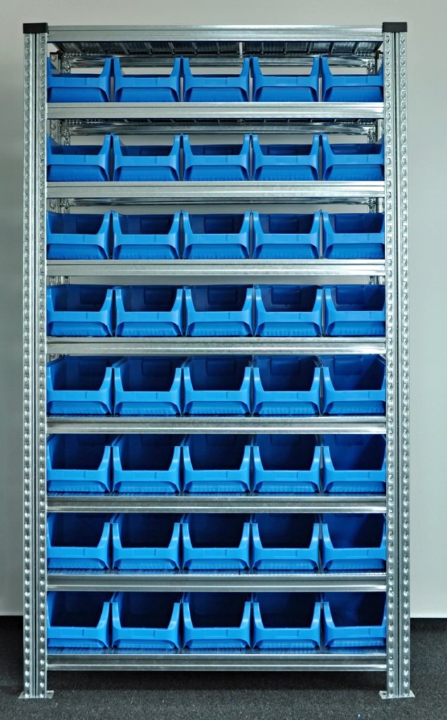 Screwless metal rack with plastic boxes. 9x shelves, load capacity 125 kg, column load capacity 1100 kg. Rack dimensions h. 1972 x w. 1124 x d. 410 mm. Contains 40x plastic box 456212. Warranty 2 years.