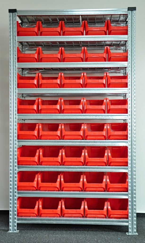 Screwless metal rack with plastic boxes. 9x shelves, load capacity 125 kg, column load capacity 1100 kg. Rack dimensions h. 1972 x w. 1124 x d. 410 mm. Contains 40x plastic box 456213. Warranty 2 years.