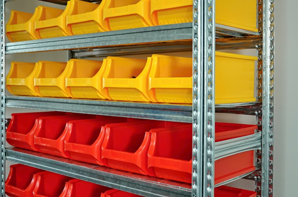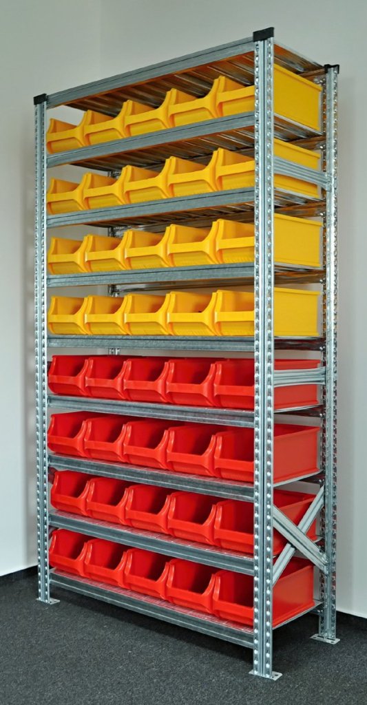 Screwless metal rack with plastic boxes. 9x shelves, load capacity 125 kg, column load capacity 1100 kg. Rack dimensions h. 1972 x full description and parameters