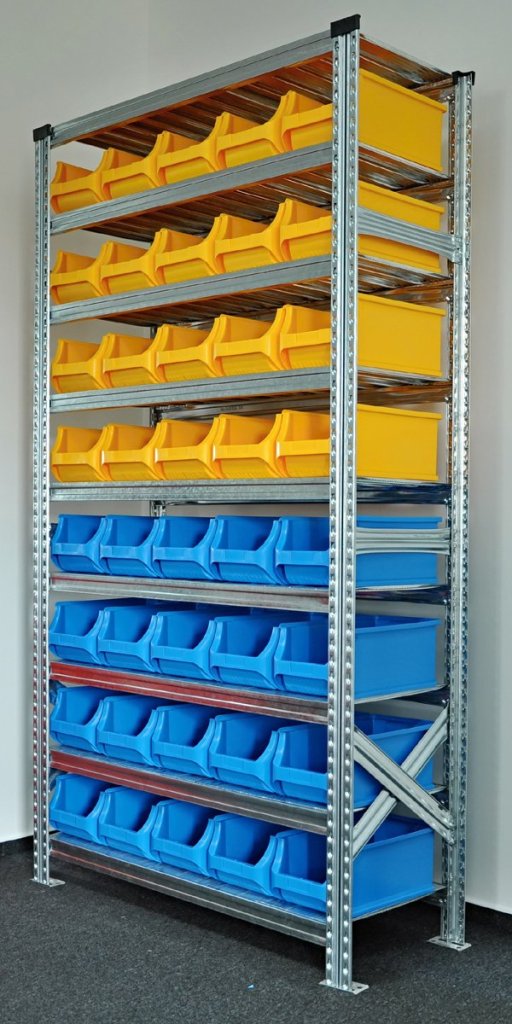 Screwless metal rack with plastic boxes. 9x shelves, load capacity 125 kg, column load capacity 1100 kg. Rack dimensions h. 1972 x full description and parameters