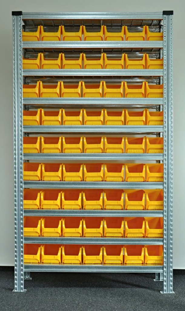 Screwless metal rack with plastic boxes. 10x shelves, load capacity 125 kg, column load capacity 1100 kg. Rack dimensions h. 1972 x w. 1124 x d. 330 mm. Contains 63x plastic box 456209. Warranty 2 years.