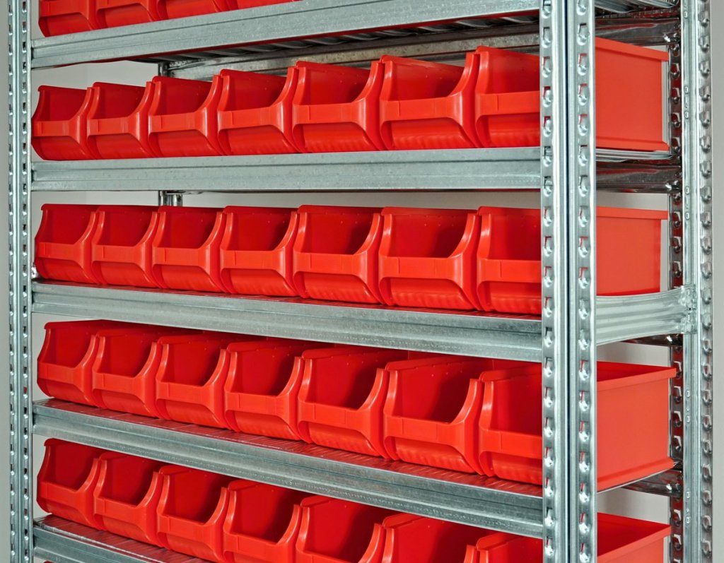 Screwless metal rack with plastic boxes. 10x shelves, load capacity 125 kg, column load capacity 1100 kg. Rack dimensions h. 1972 x w. 1124 x d. 330 mm. Contains 63x plastic box 456209. Warranty 2 years.