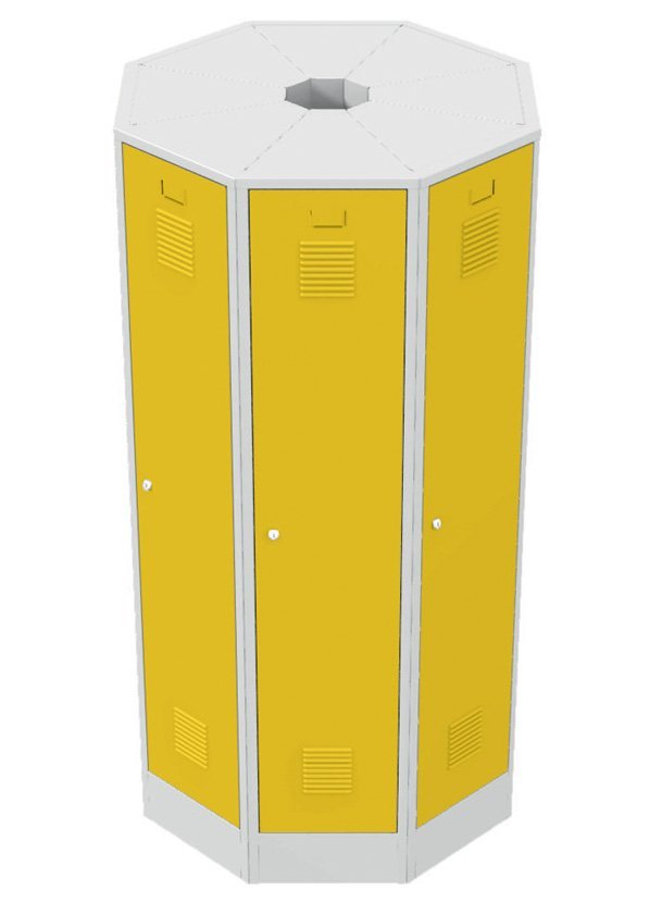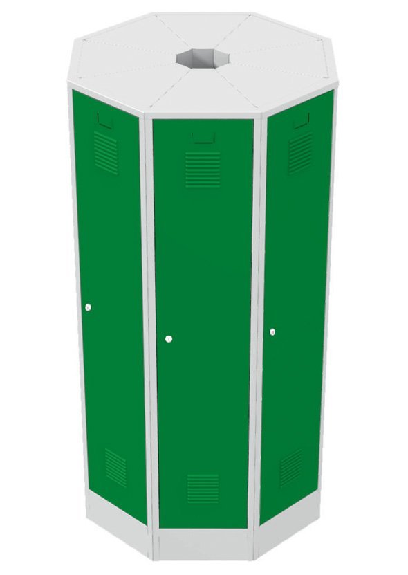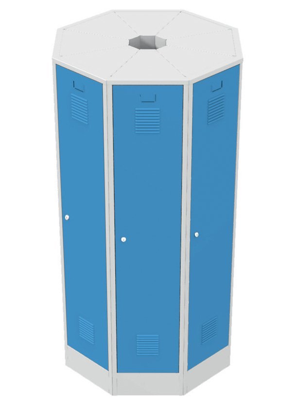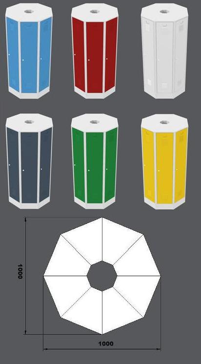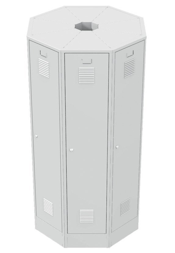A set of 8 triangular RAS cabinets designed to be assembled into a free-standing circular block. The advantage is a large number of wardrobe compartments (8 units) in a free-standing monolith, which is intended for installation in the space. Height 1850 x width 1000 x depth 1000 mm. Body color RAL 7035 light gray.