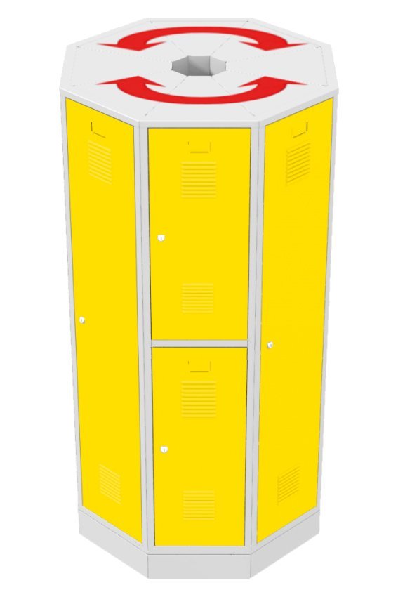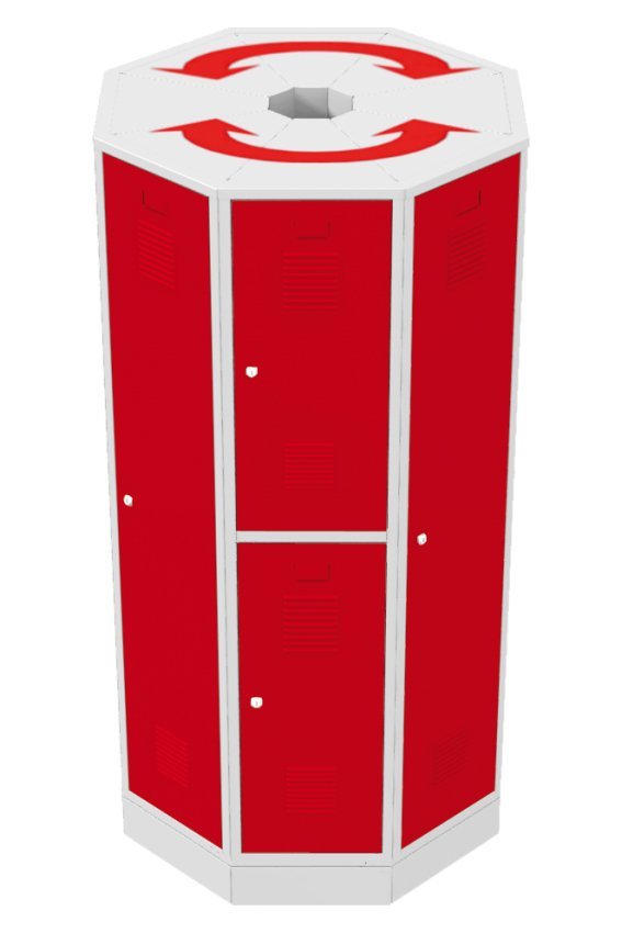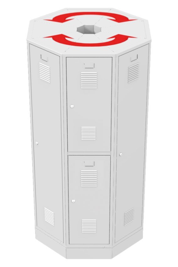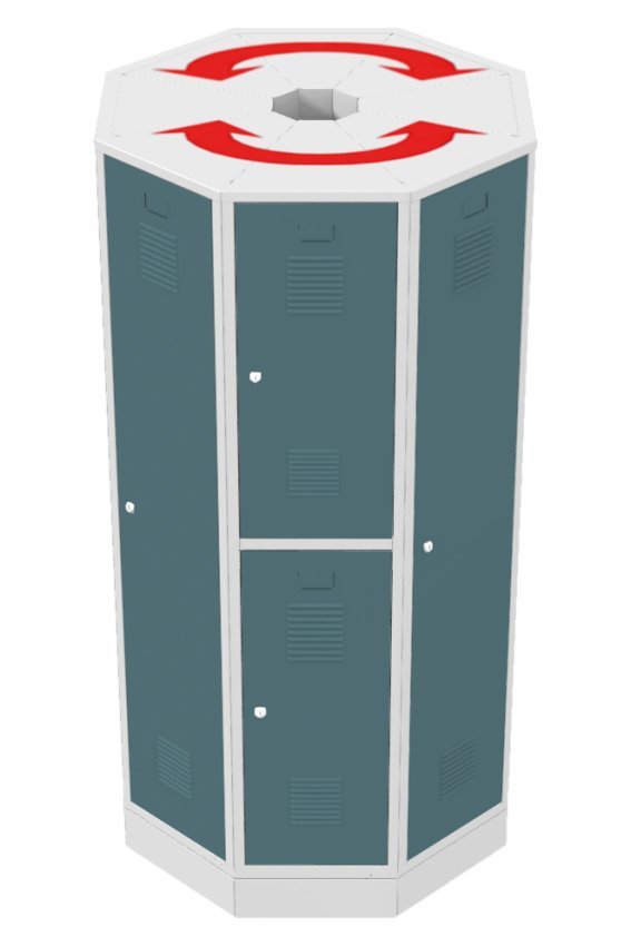 Small-volume triangular-shaped cabinet suitable for ending sets of standard wardrobes with a depth of 500 mm, filling the corners between standard wardrobes or free-standing sets in the space. Height 1850 x width 380 x depth 370 mm. Body color RAL 7035 light gray.
