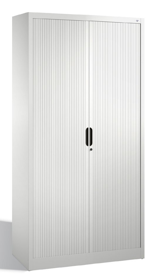 Rolled metal cabinet with two doors. Height 1980, width 1000, depth 420 mm. Four shelves. Color of body and blinds light gray RAL full description and parameters