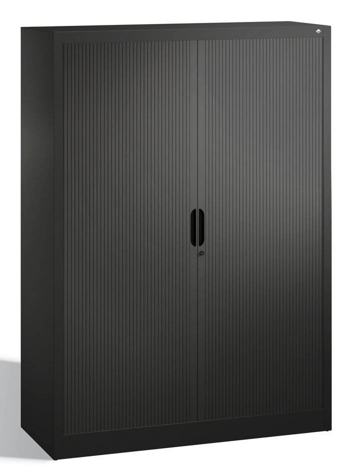 Rolled metal cabinet with two doors. Height 1660, width 1200, depth 420 mm. 3 shelves. Color of body and blinds light gray RAL 7035/anthracite RAL 7021.