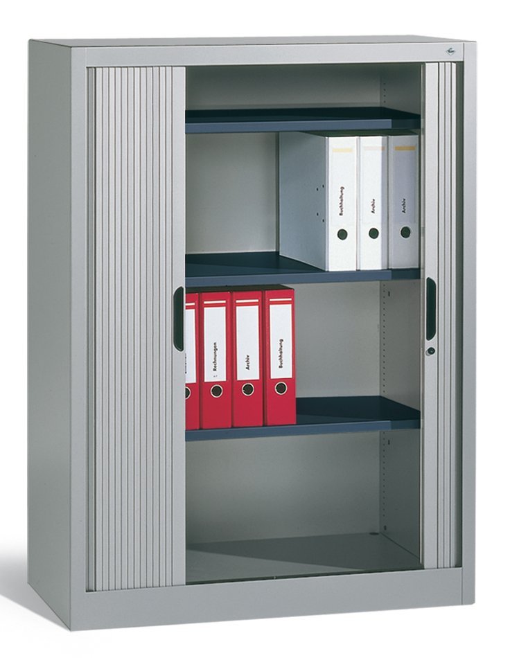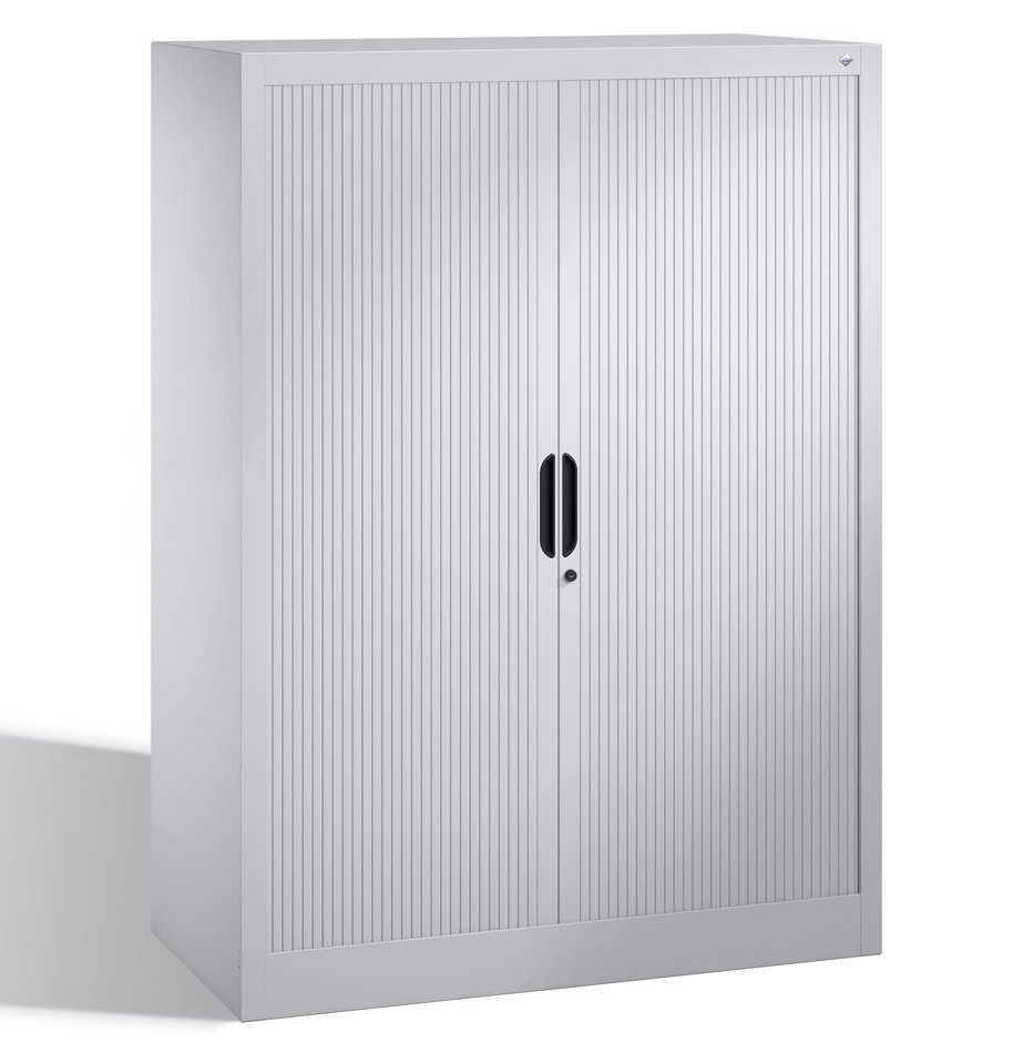Rolled metal cabinet with two doors. Height 1345, width 1000, depth 420 mm. 3 shelves. Color of body and blinds light gray RAL 7035/anthracite RAL 7021.