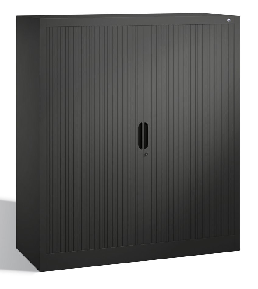 Rolled metal cabinet with two doors. Height 1345, width 1200, depth 420 mm. 3 shelves. Color of body and blinds light gray RAL 7035/anthracite RAL 7021.