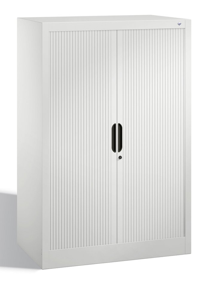 Rolled metal cabinet with two doors. Height 1230, width 800, depth 420 mm. 2 shelves. Color of body and blinds light gray RAL 7035 full description and parameters