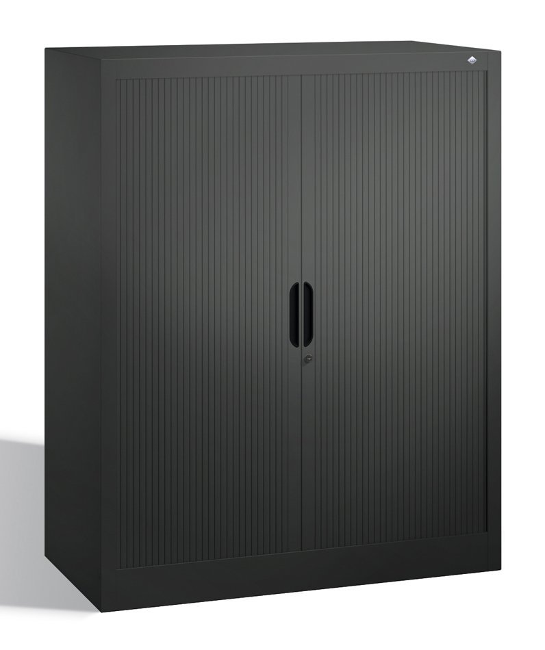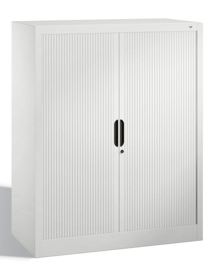 Rolled metal cabinet with two doors. Height 1230, width 1000, depth 420 mm. 2 shelves. Color of body and blinds light gray RAL 7035/anthracite RAL 7021.