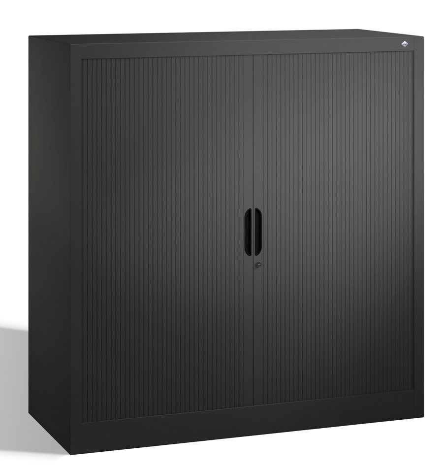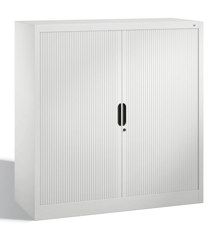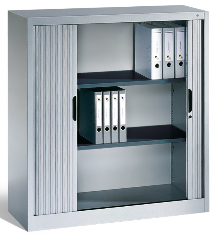 Rolled metal cabinet with two doors. Height 1230, width 1200, depth 420 mm. 2 shelves. Color of body and blinds light gray RAL 7035/anthracite RAL 7021.
