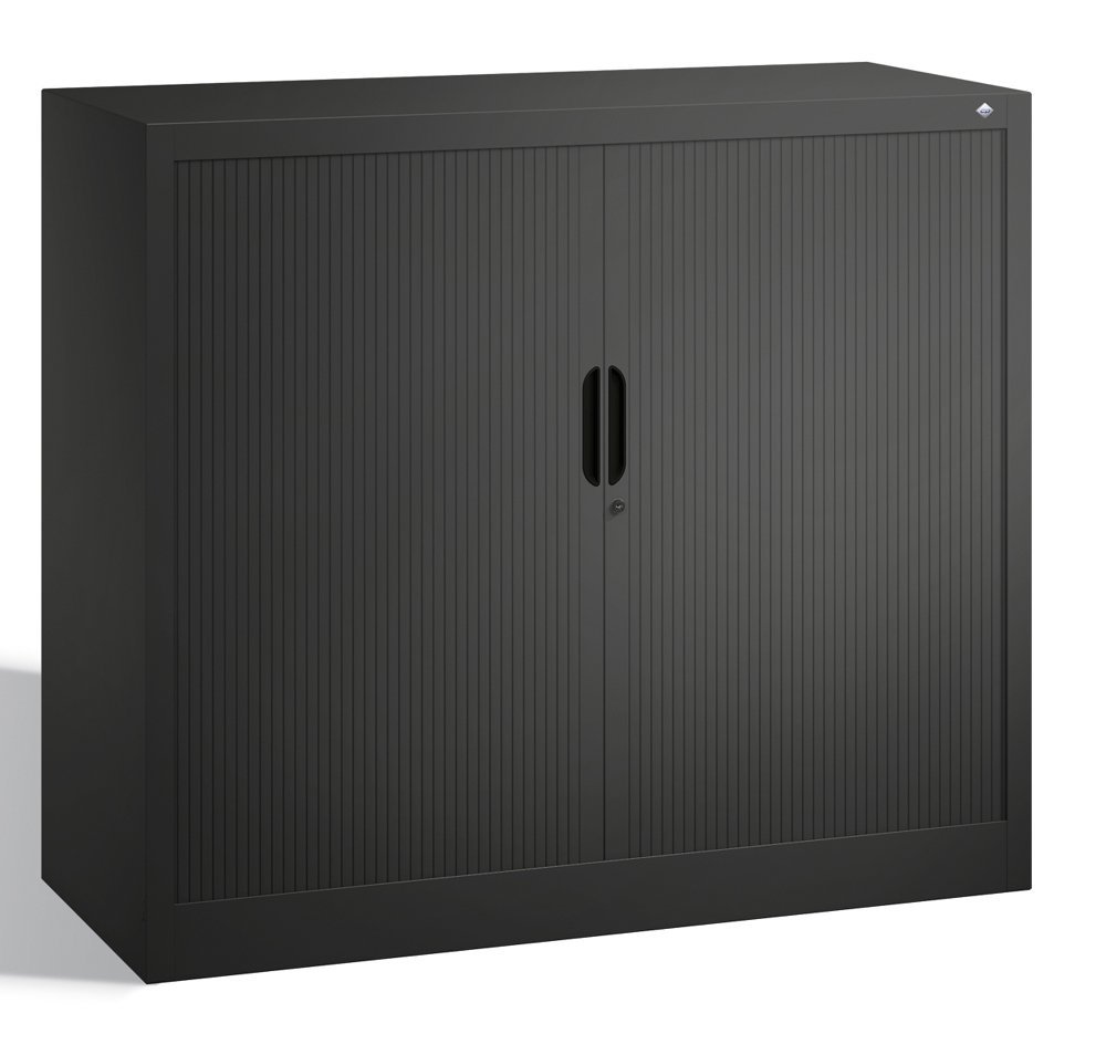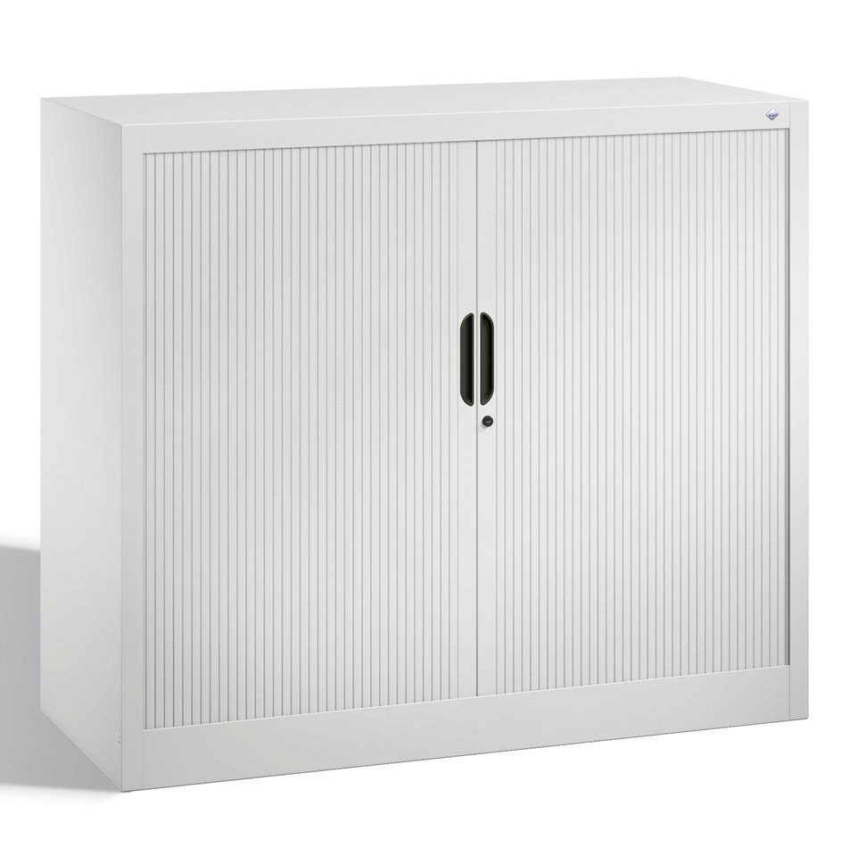 Rolled metal cabinet with two doors. Height 1030, width 1200, depth 420 mm. 2 shelves. Color of body and blinds light gray RAL 7035/anthracite RAL 7021.